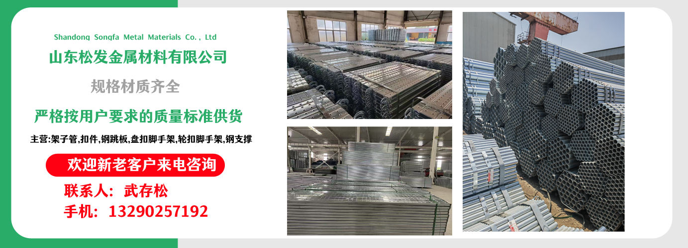 山東松發(fā)金屬材料有限公司主營架子管,扣件,鋼跳板,盤扣腳手架,輪扣腳手架,鋼支撐生產(chǎn)廠家。本廠專業(yè)生產(chǎn)銷售?! 〗ㄖ眉茏庸?、 主要用于房建,橋梁,鐵路,公路,地鐵,水庫,隧道,支撐?! 〖茏庸?扣件,鋼跳板,盤扣腳手架,輪扣腳手架,鋼支撐的優(yōu)越性及應(yīng)用“ ”產(chǎn)品因具有結(jié)構(gòu)簡單合理、設(shè)計巧妙、使用方便、安全、快捷、易于運輸、儲存、維護簡單等特點?! 」疽回瀳猿帧百|(zhì)量,用戶至上,優(yōu)質(zhì)服務(wù),信守合同”的宗旨,憑借著高質(zhì)量的產(chǎn)品,良好的信譽,優(yōu)質(zhì)的服務(wù),產(chǎn)品暢銷全球。歡迎廣大客戶來電洽談,共同發(fā)展,共創(chuàng)輝煌! 山東松發(fā)金屬材料有限公司秉承誠信服務(wù)、恪守信譽的宗旨,在同等的質(zhì)量下,保證以最低的價格,最完善的服務(wù),最高的信譽來答謝各界朋友的支持和厚愛,歡迎您的來電、咨詢,我們將竭誠為您服務(wù)!...